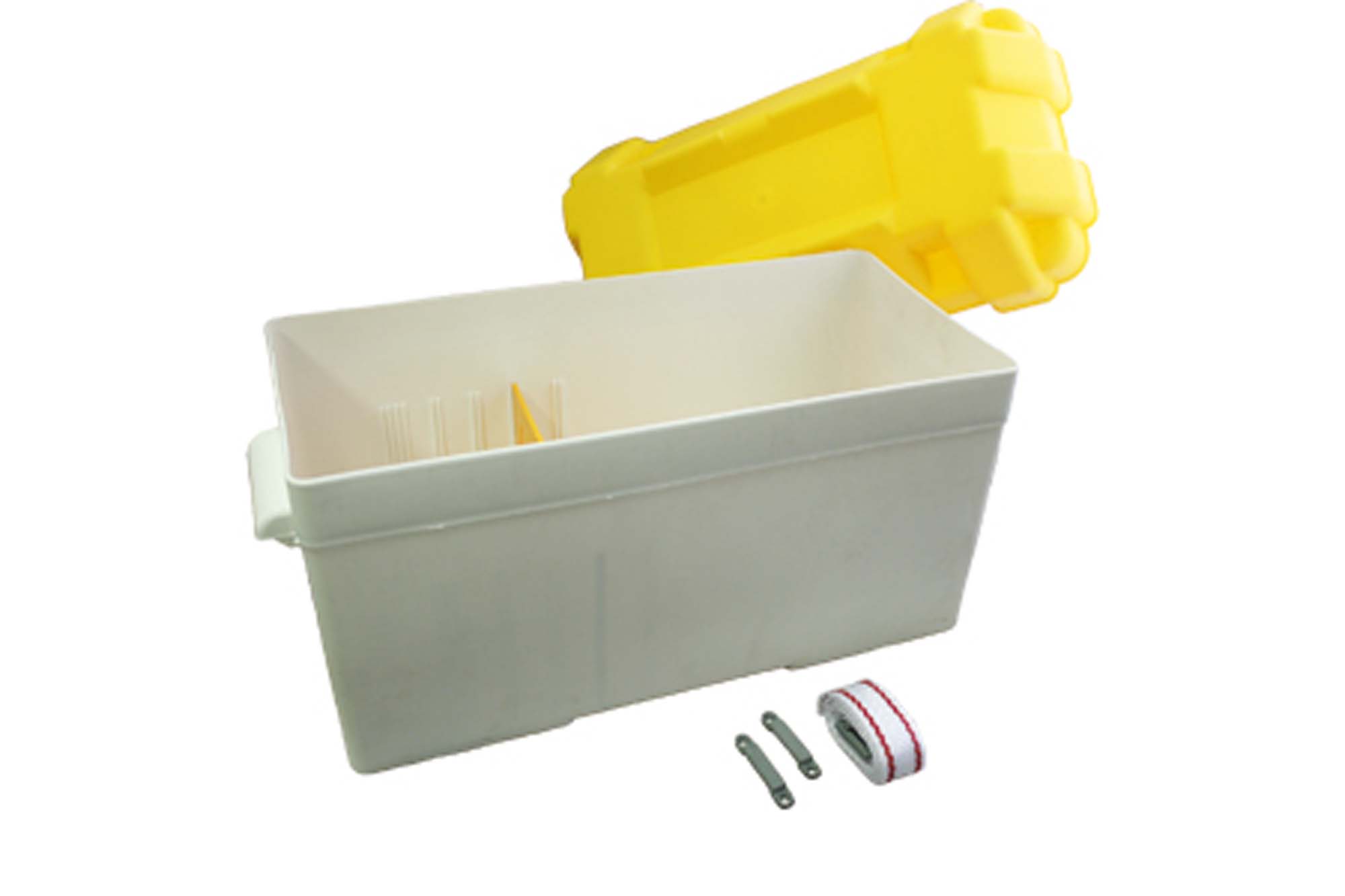 Deze witte accubak is gemaakt van stevig kunststof. Hij is voorzien van een veiligheidsriem en is gemakkelijk te bevestigen met de bijgeleverde montagebeugels. Met deksel. Afmetingen: 200X140X200