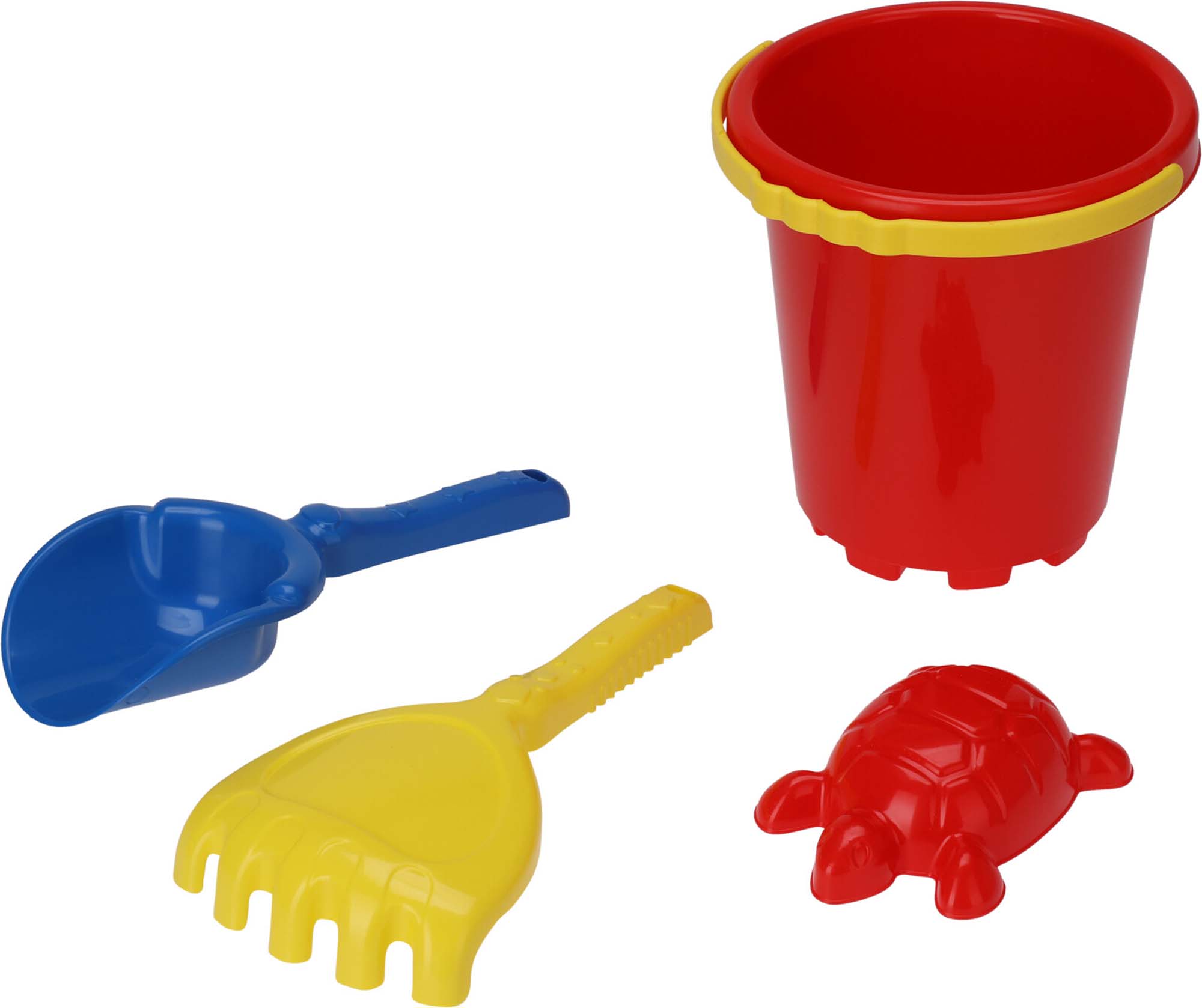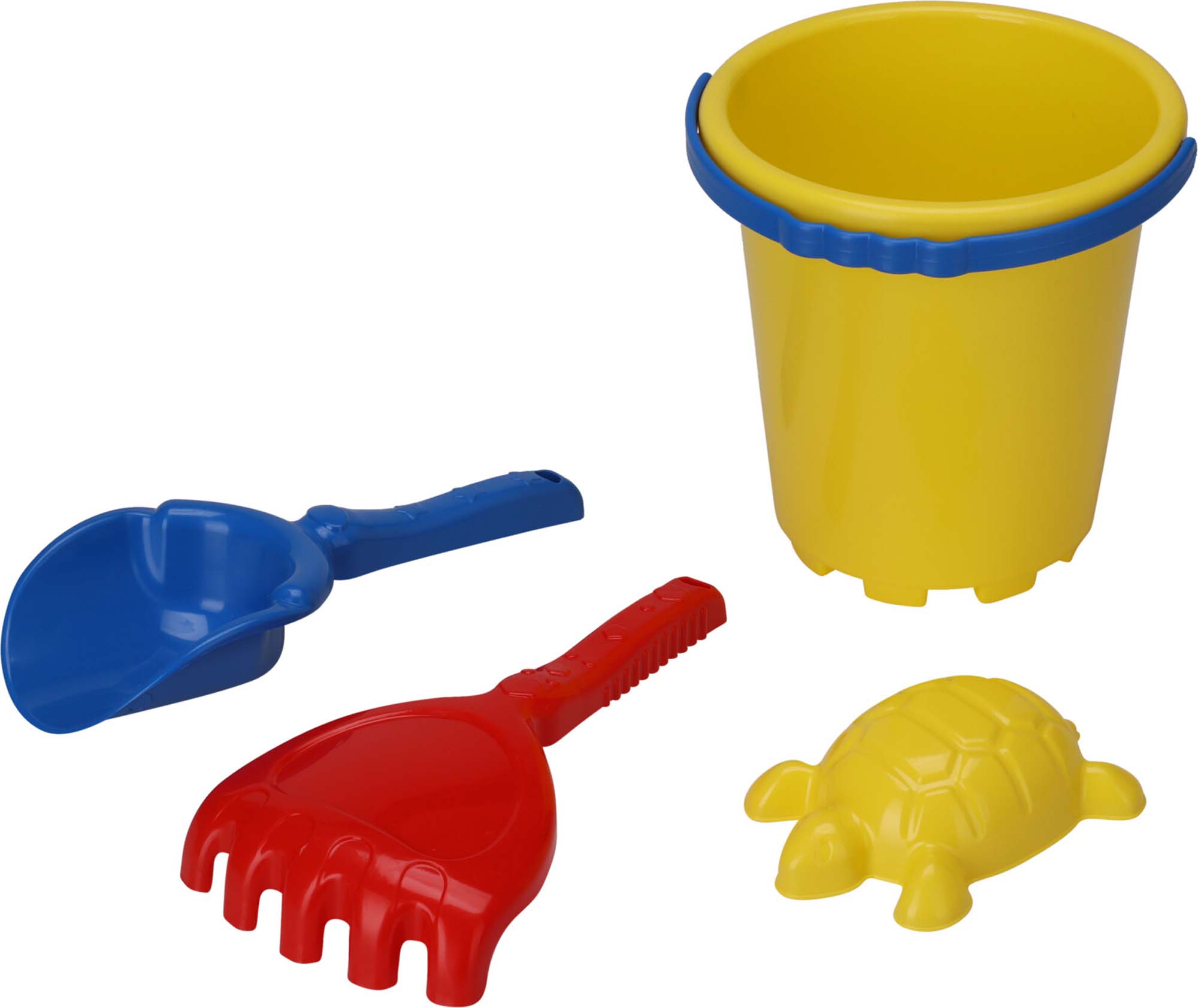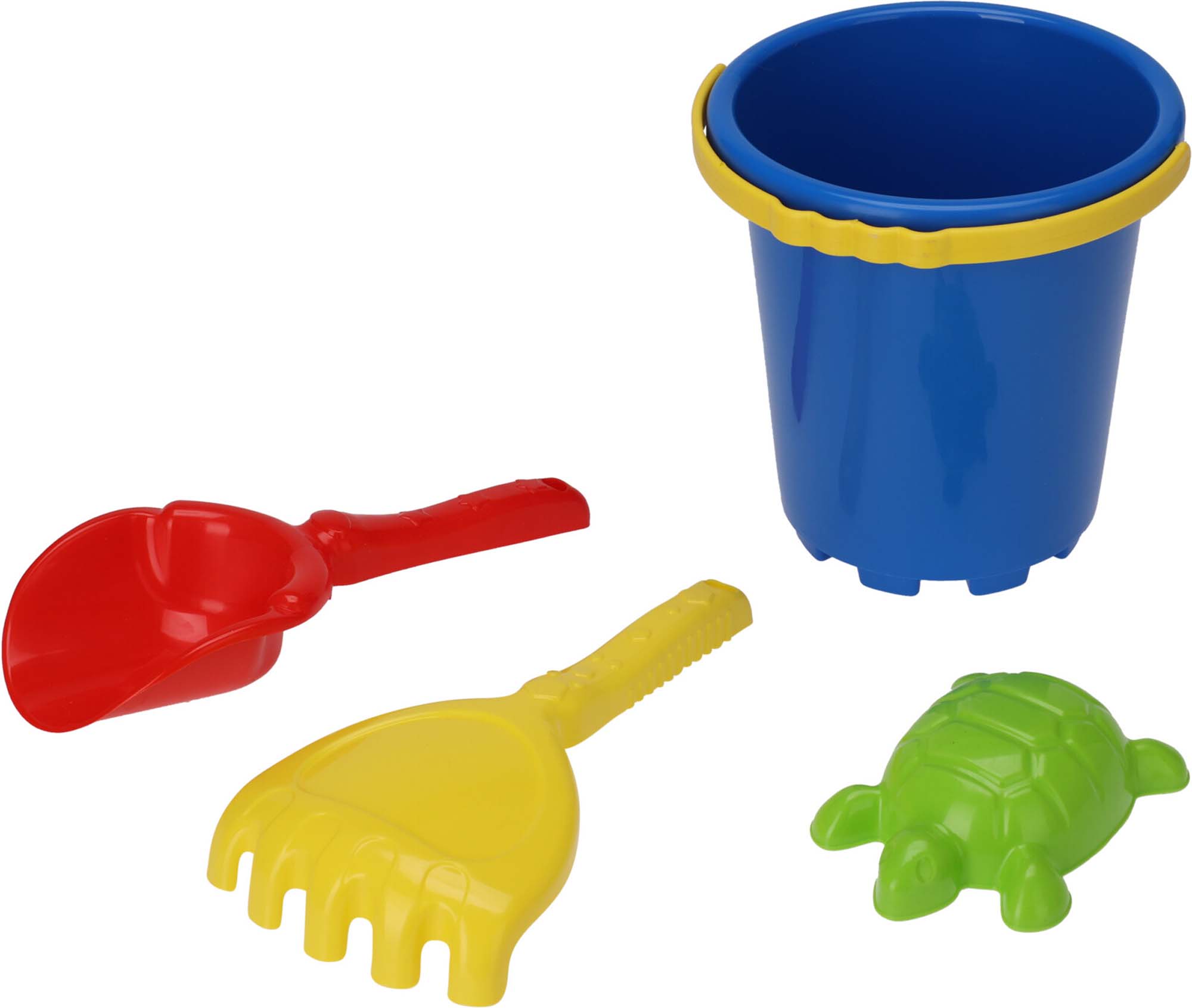 Zand speelgoed, bestaande uit een emmertje, schepje, harkje en een vormpje (schildpad).