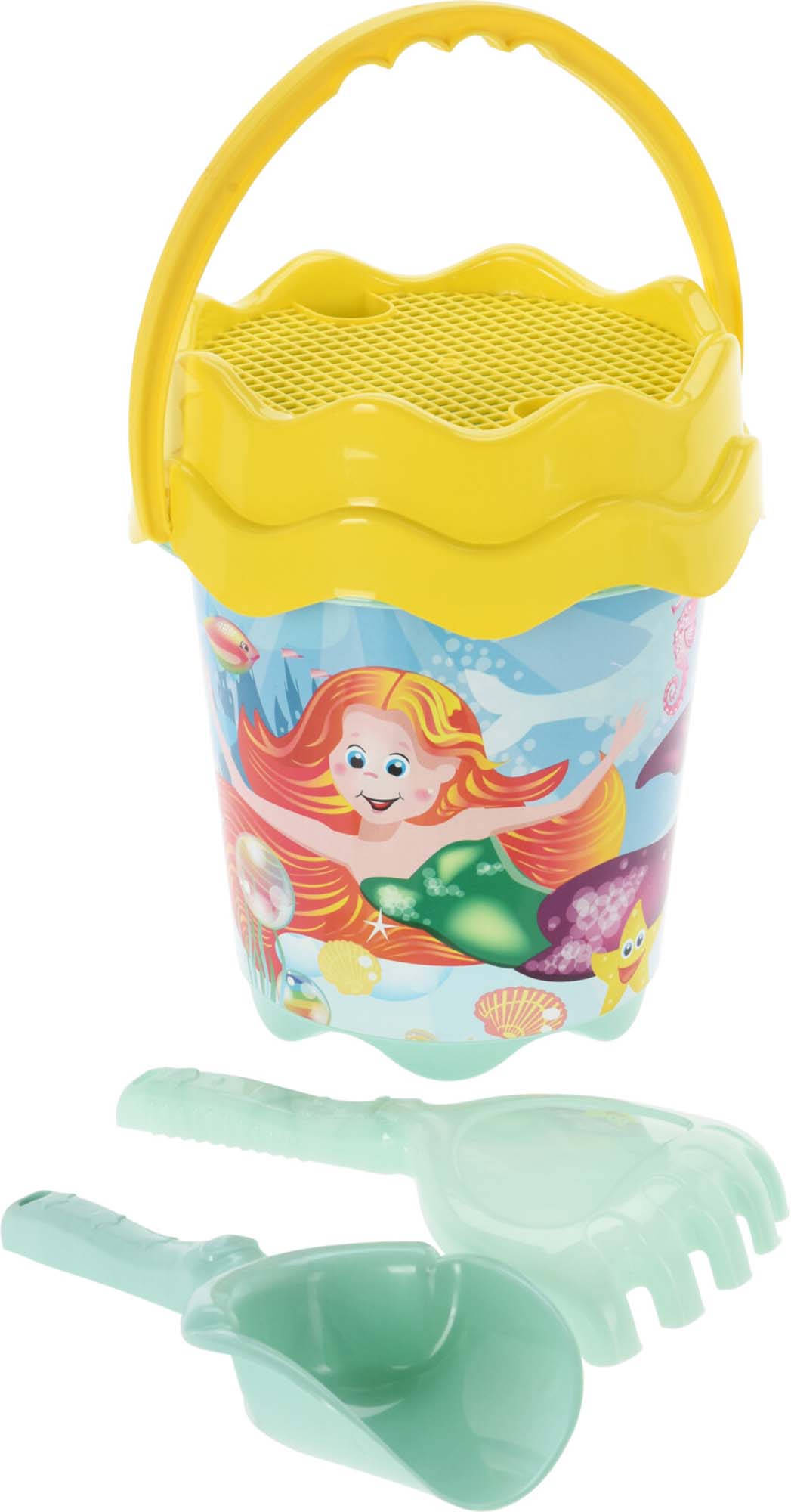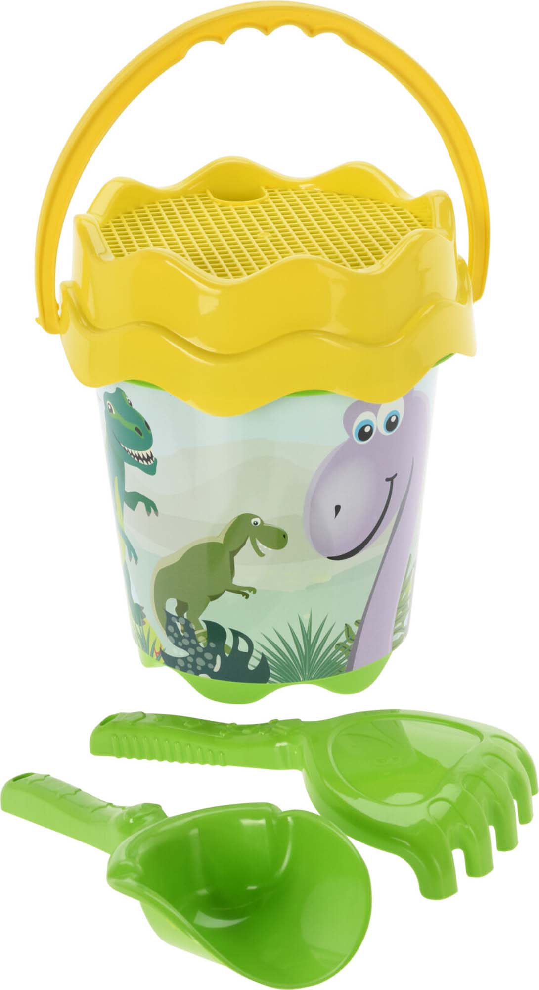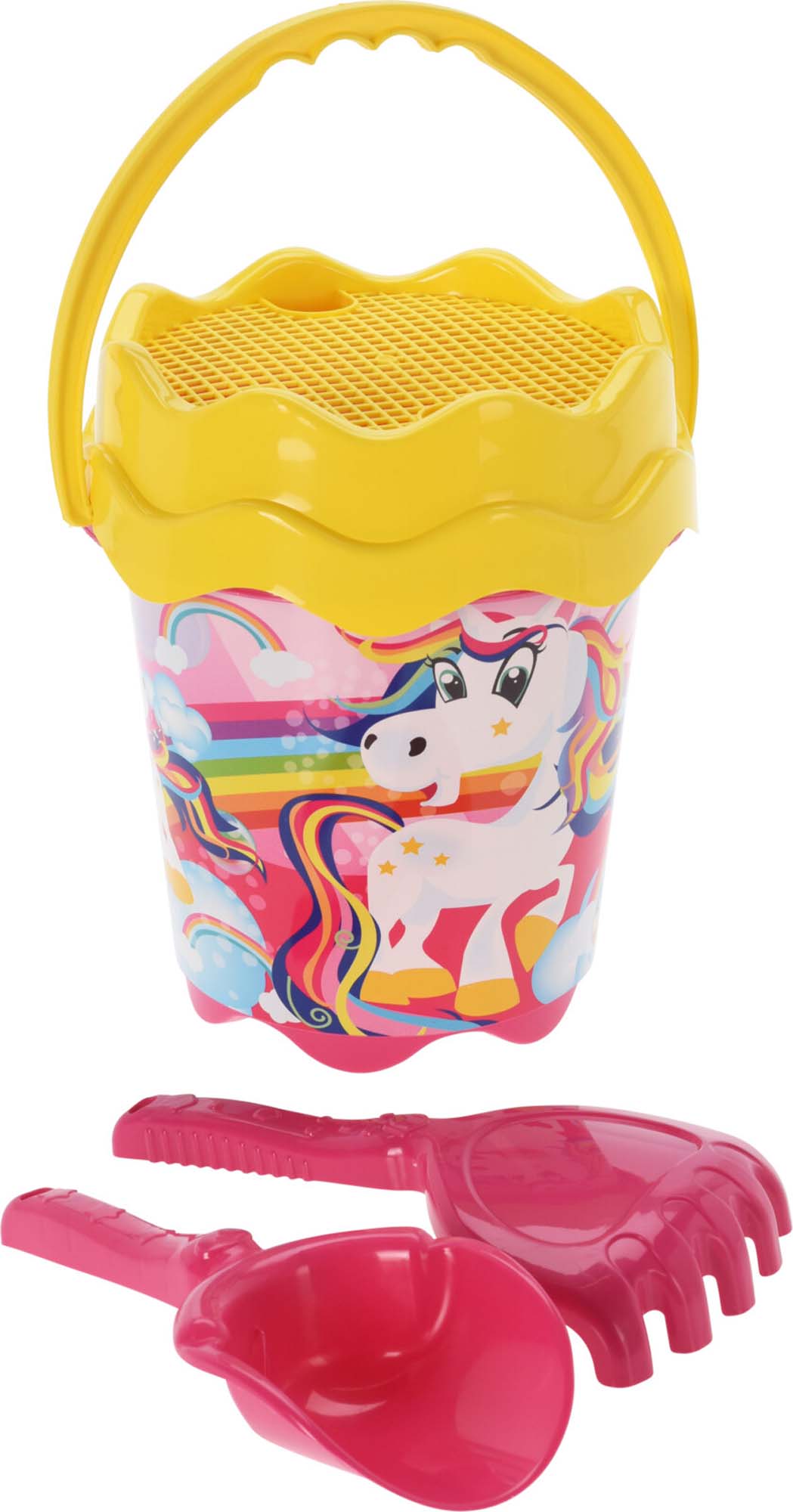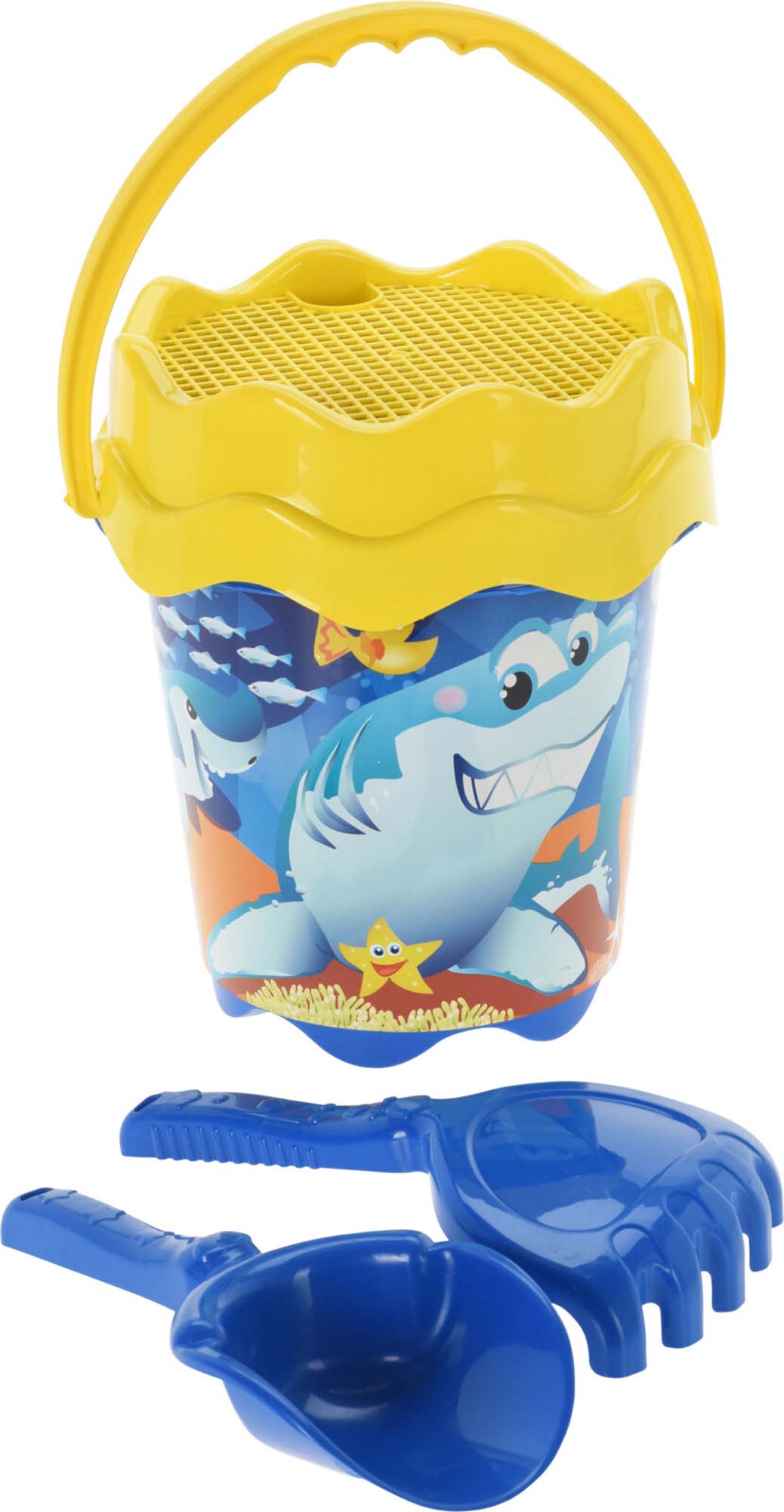 Zand setje, bestaande uit een emmertje, schepje en harkje.