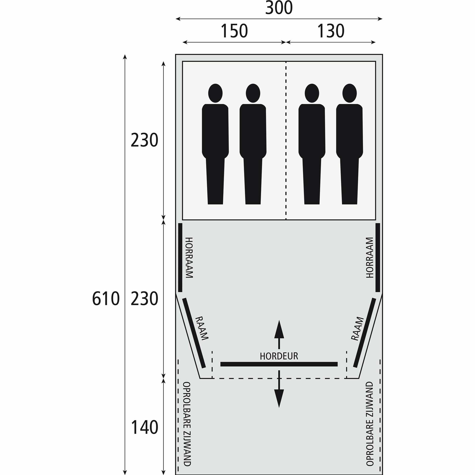 De tent heeft twee slaapcabines, elke cabine is voor twee personen geschikt. Deze cabines zijn 230 cm lang en extra donker voor meer slaapcomfort. De wegritsbare scheidingswand zorgt voor een flexibele indeling van de slaapcabines. De horramen rechts en links zijn van binnenuit afsluitbaar.