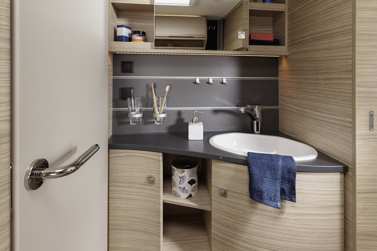 - Openslaand raam van melkglas in badkamer, met verduisterings- en muggenrollo 3-pits kookplaat met elektrische ontsteking, thermobeveiliging, mat geëmailleerd rooster en glazen afdekplaat en separate wasbak met glazen afdekplaat