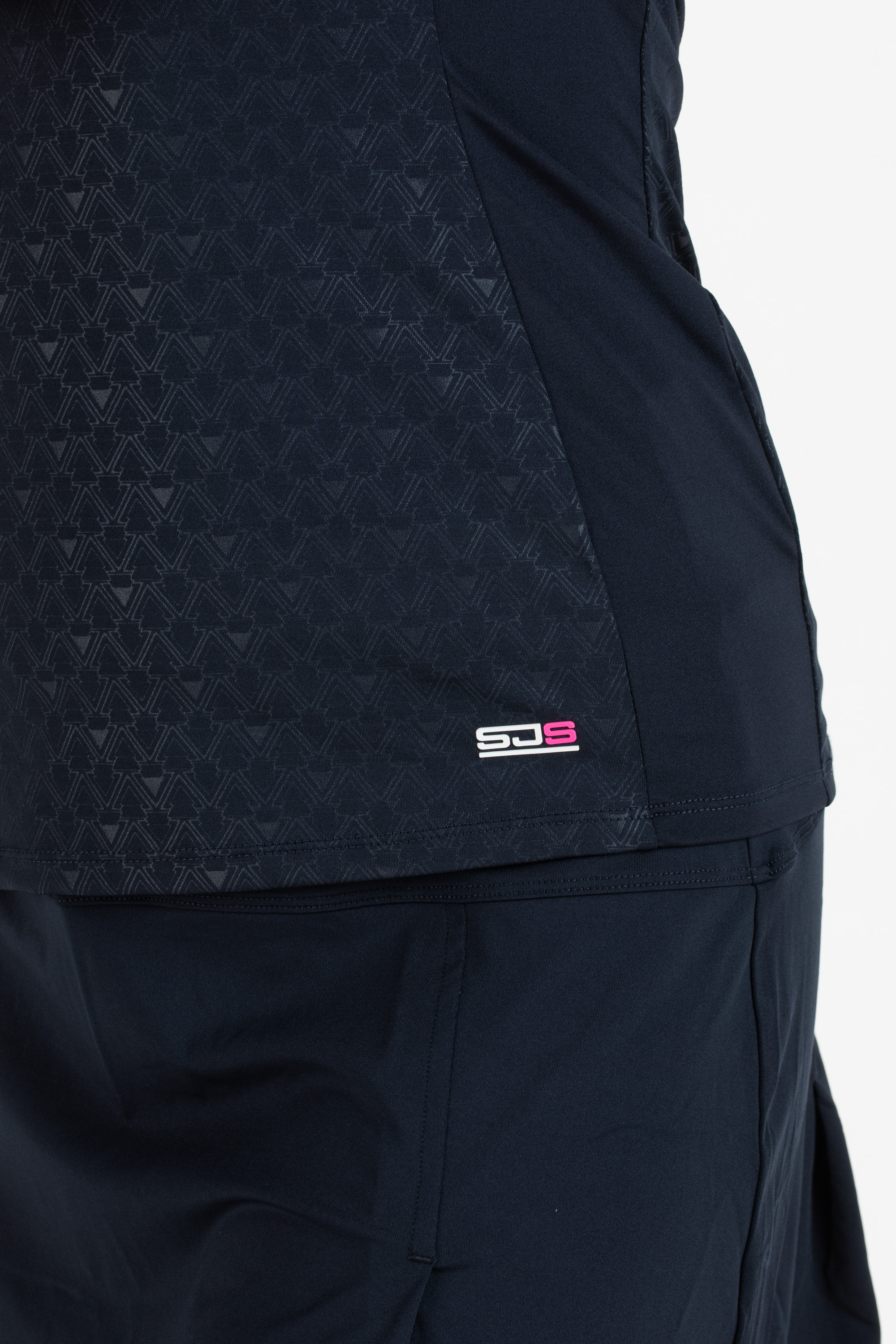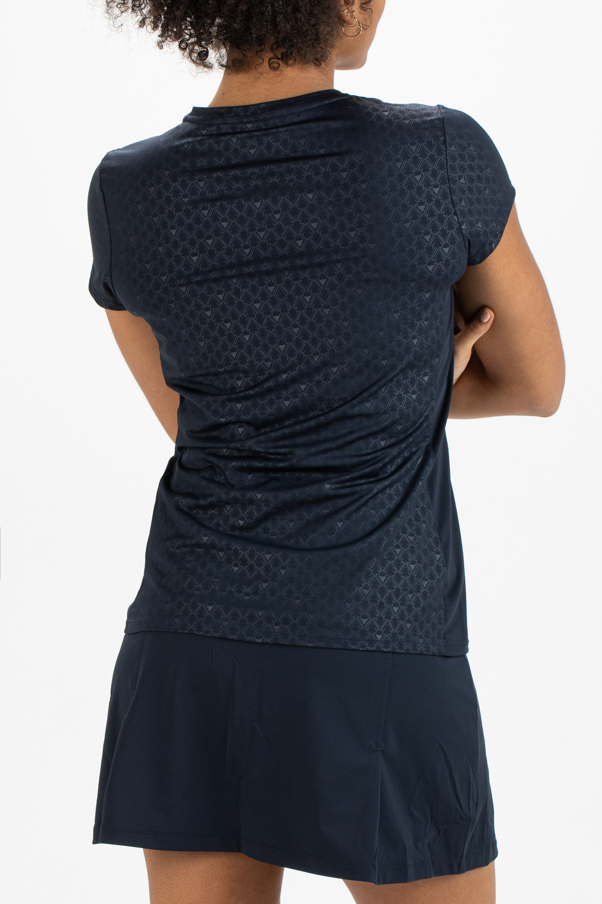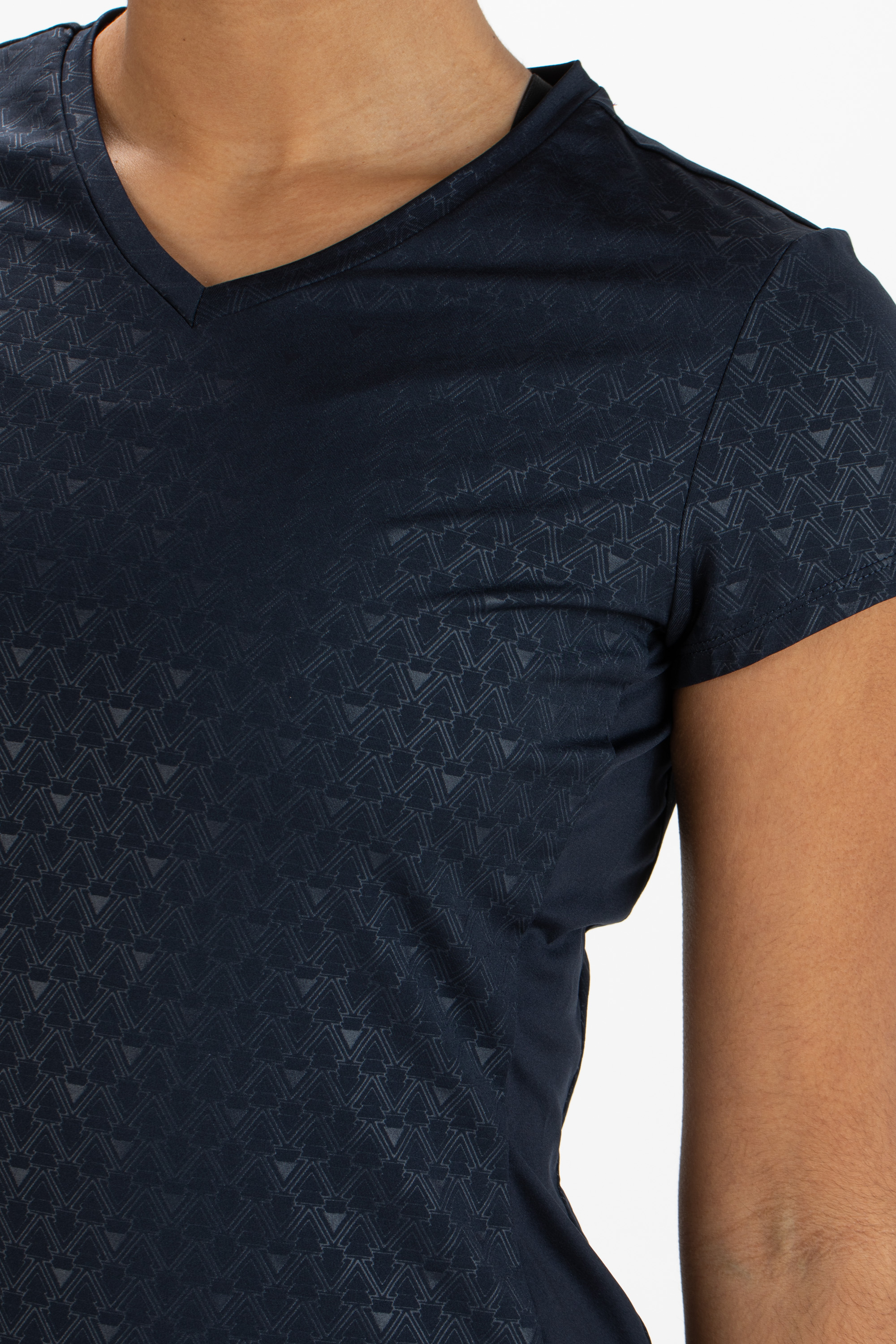 Elegant, getailleerd dames shirt met een luchtige v-hals. Dit shirt is gemaakt van donkerblauwe single jersey met een all-over print en effen inzetten langs de zijnaden.