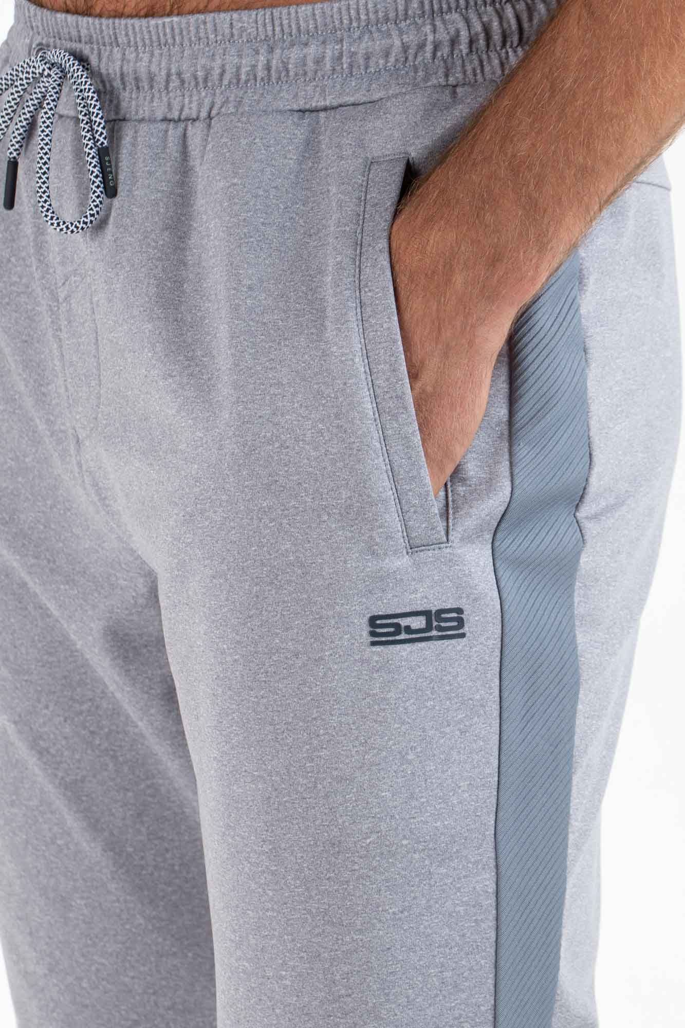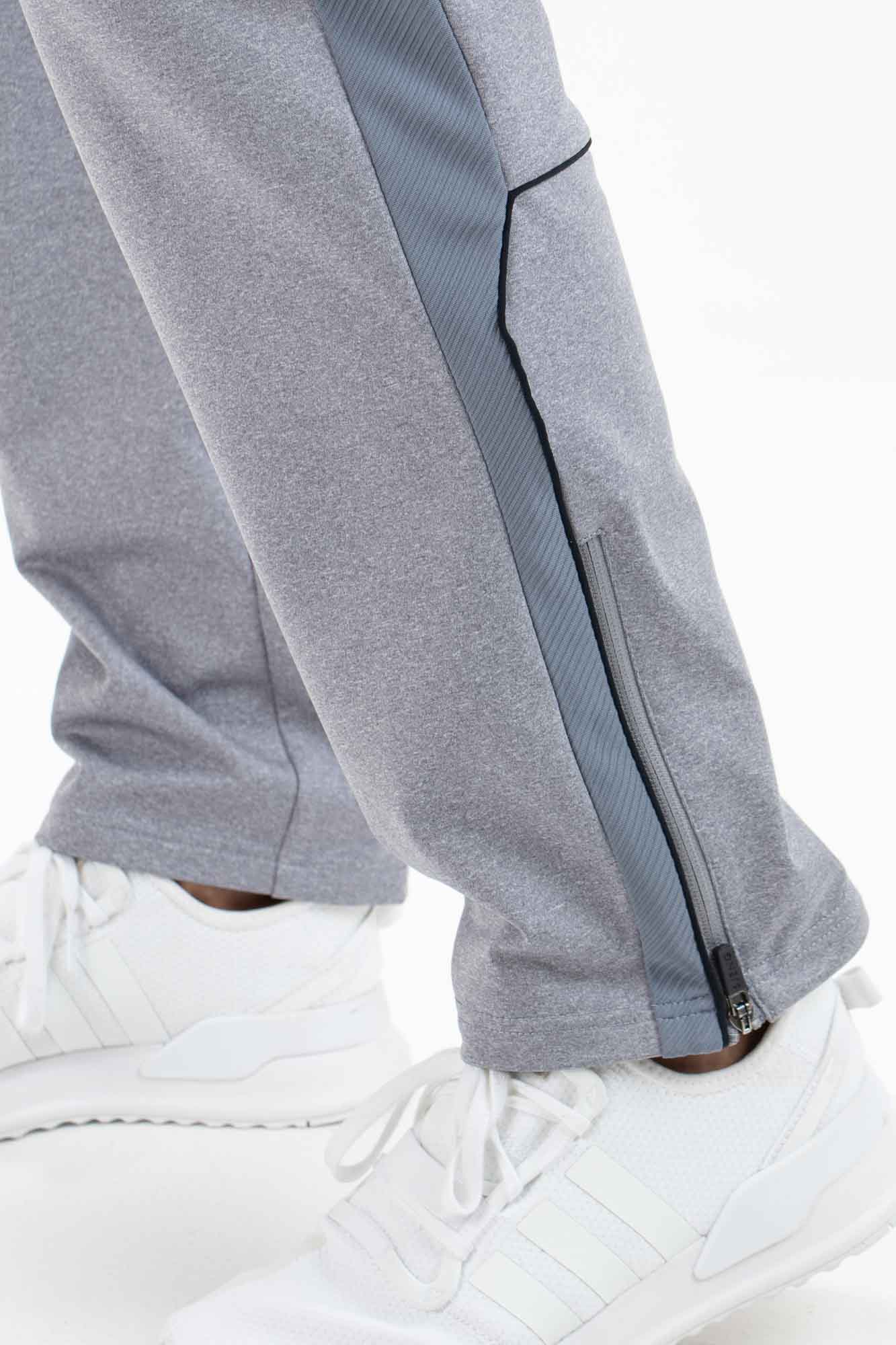 Sportieve heren trainingsbroek met langs de zijnaden inzetten van in reliëf gebreid materiaal. Deze comfortabele broek is gemaakt van soepele, gemêleerde grijze powerstretch. Hij heeft ritsen onderaan de pijpen bij de enkels en bij de kuiten zitten contrasterende strepen.